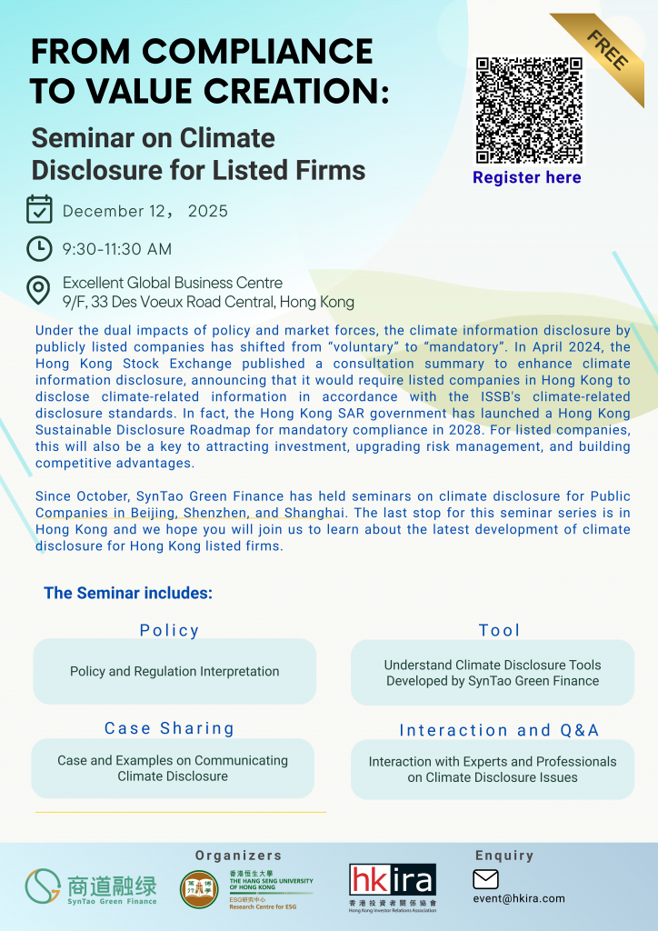 Since October, SynTao Green Finance has held seminars on climate disclosure for Public Companies in Beijing, Shenzhen, and Shanghai. The last stop for this seminar series is in Hong Kong and we hope you will join us to learn about the latest development of climate disclosure for Hong Kong listed firms.