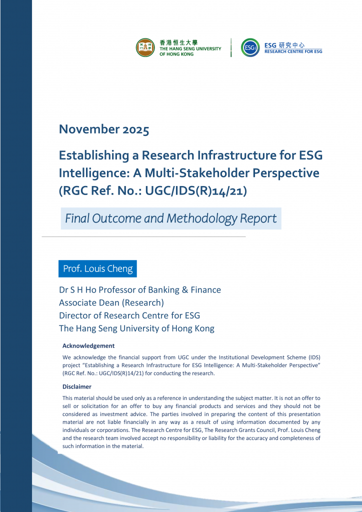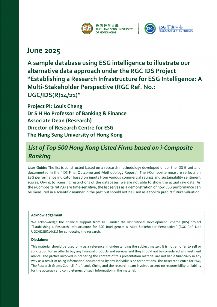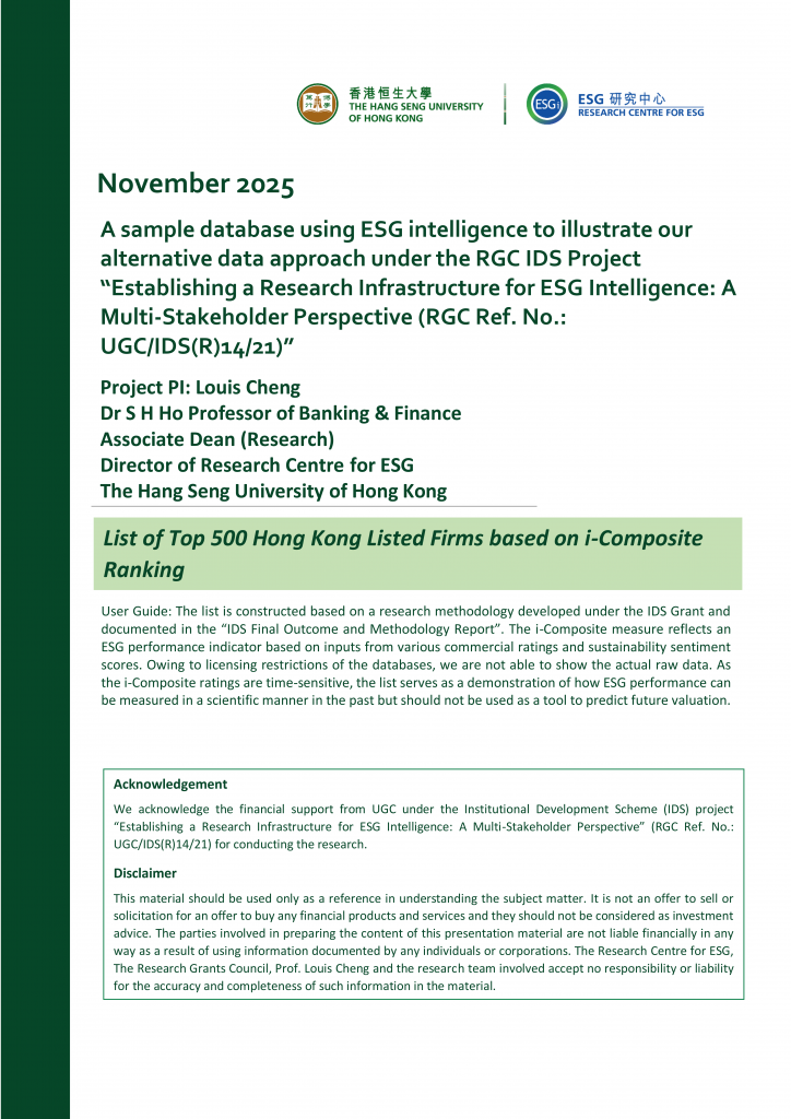 This project is based on research funded by an RGC IDS Grant titled “Establishing a Research Infrastructure for ESG Intelligence: A Multi-Stakeholder Perspective” (RGC Ref. No.: UGC/IDS(R)14/21). We recognize the importance of measuring ESG efforts and performance from stakeholders’ perspectives. The objective of this project is to provide a clear road map with a scientific methodology to demonstrate how the stakeholders of the four Research Components (RCs) can use a tailor-made ESG intelligence through our research findings from the IDS project. Our goal is to create an alternative data for listed firms to support an efficient business decision for the stakeholders.