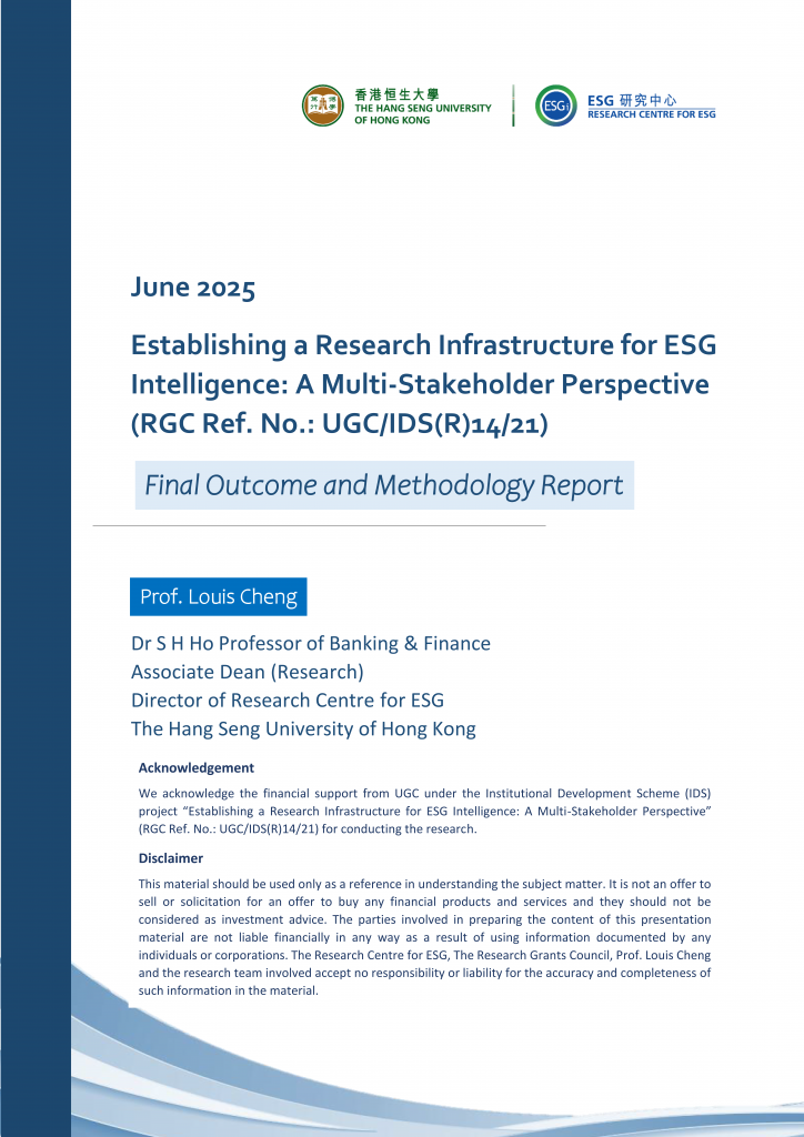 This material should be used only as a reference in understanding the subject matter. It is not an offer to sell or solicitation for an offer to buy any financial products and services and they should not be considered as investment advice. The parties involved in preparing the content of this presentation material are not liable financially in any way as a result of using information documented by any individuals or corporations. The Research Centre for ESG, The Research Grants Council, Prof. Louis Cheng and the research team involved accept no responsibility or liability for the accuracy and completeness of such information in the material.